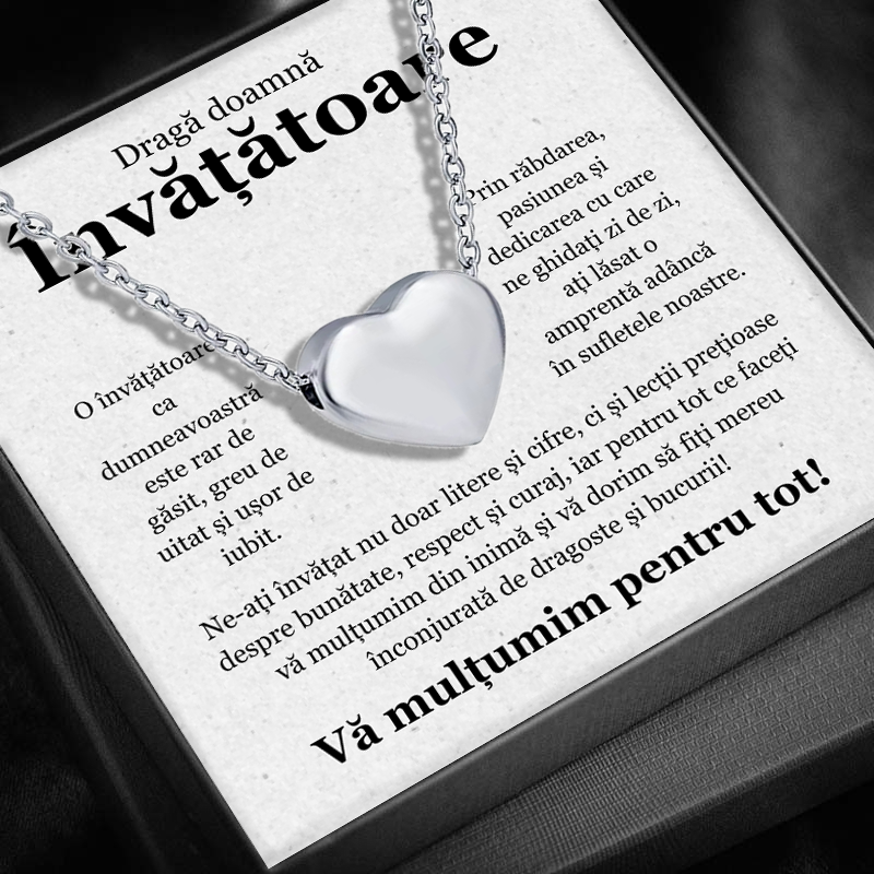 Imaginează-ți zâmbetul doamnei învățătoare în momentul în care deschide cutiuța și descoperă acest colier elegant, Aurora inimii .