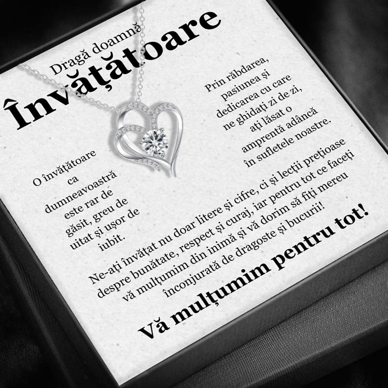 Imaginează-ți zâmbetul doamnei învățătoare în momentul în care deschide cutiuța și descoperă acest colier elegant, Inima Eternă.