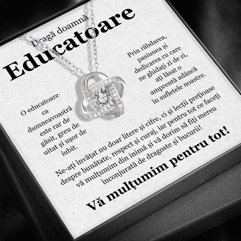 Imaginează-ți zâmbetul doamnei educatoare în momentul în care deschide cutiuța și descoperă acest colier elegant, Love Knot. Un simbol al respectului și al legăturii speciale dintre voi, o legătură ce s-a construit și s-a întărit de-a lungul timpului. Pandantivul, decorat cu cristale cubic zirconia, radiază o strălucire delicată, oglindind răbdarea, pasiunea și dăruirea doamnei educatoare.