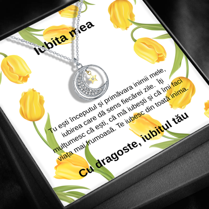 Imaginează-ți zâmbetul ei în momentul în care deschide cutiuța și descoperă acest colier elegant  Lumina lunii . Simbol al conexiunii profunde și al iubirii eterne, pandantivul este delicat decorat cu cristale cubic zirconia, ce oferă o strălucire aparte. Un cadou de neuitat pentru persoana care îți face inima să bată mai tare.