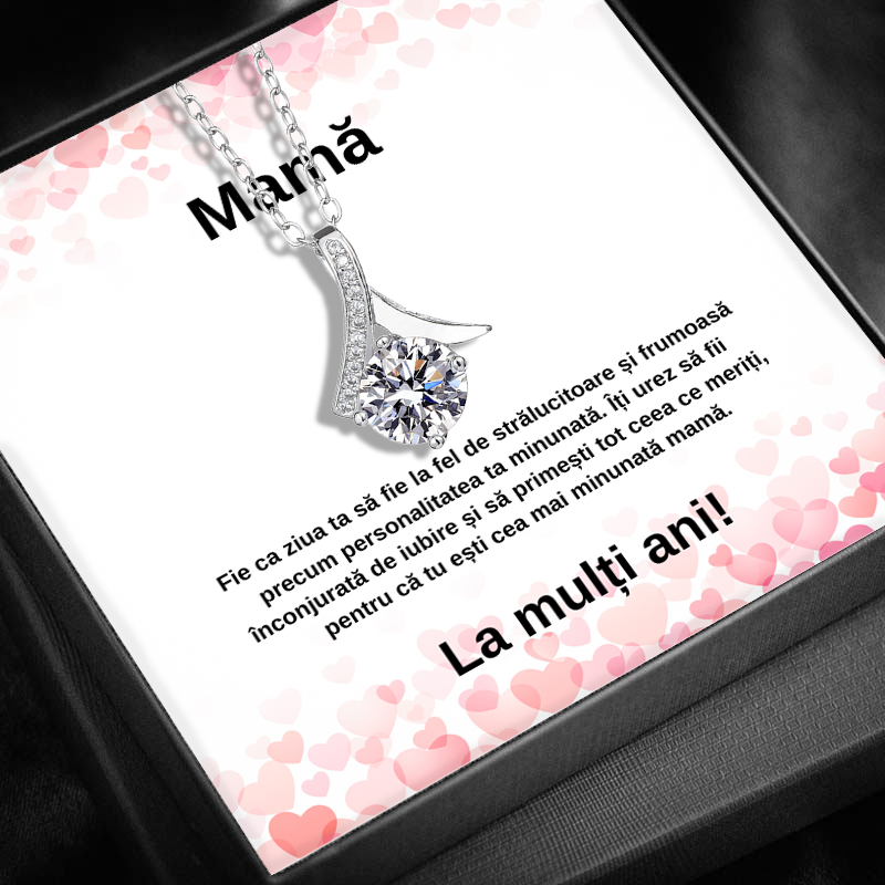 Imaginează-ți zâmbetul mamei tale în momentul în care deschide cutiuța și descoperă acest colier elegant, Talisman de lumina . Un simbol al iubirii pure și al legăturii speciale dintre voi, o legătură ce se întărește în fiecare zi. Pandantivul, decorat cu cristale cubic zirconia, radiază o strălucire delicată, oglindind frumusețea, blândețea și sufletul tău curat.