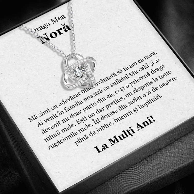 Imaginează-ți zâmbetul nurorii tale în momentul în care deschide cutiuța și descoperă acest colier elegant, Love Knot. Un simbol al iubirii ce a legat-o de familia ta și al legăturii profunde care se construiește zi de zi. Pandantivul, decorat cu cristale cubic zirconia, radiază o strălucire subtilă, oglindind frumusețea și bunătatea ei. Un cadou perfect pentru femeia care aduce lumină și armonie în familia ta, un dar care va rămâne mereu ca un simbol al aprecierii și recunoștinței pentru tot ceea ce reprezintă.