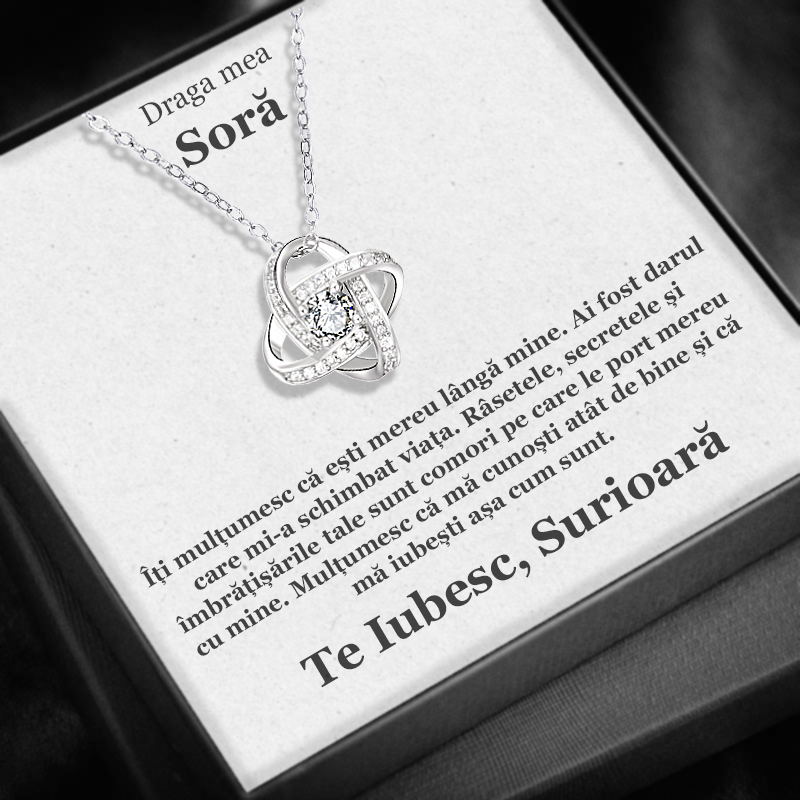 Imaginează-ți zâmbetul surorii tale în momentul în care deschide cutiuța și descoperă acest colier elegant, Love Knot. Un simbol al legăturii speciale și al iubirii necondiționate ce vă unește. Pandantivul, decorat cu cristale cubic zirconia, radiază o strălucire delicată, oglindind frumusețea și sufletul pur al surorii tale. Un cadou perfect pentru femeia care îți este mereu alături, un dar care va rămâne în amintirea voastră ca un simbol al iubirii și sprijinului de neprețuit..