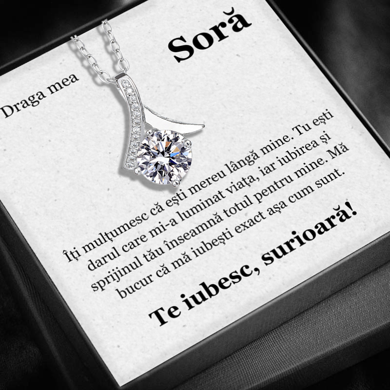 Imaginează-ți zâmbetul surorii tale în momentul în care deschide cutiuța și descoperă acest colier elegant, Talisman de lumina . Un simbol al legăturii speciale și al iubirii necondiționate ce vă unește. Pandantivul, decorat cu cristale cubic zirconia, radiază o strălucire delicată, oglindind frumusețea și sufletul pur al surorii tale. Un cadou perfect pentru femeia care îți este mereu alături, un dar care va rămâne în amintirea voastră ca un simbol al iubirii și sprijinului de neprețuit..