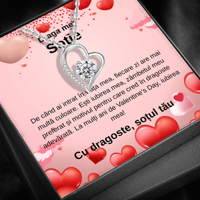 Imaginează-ți zâmbetul sotiei tale în clipa în care, în magia serii de Crăciun, deschide cutiuța și descoperă acest colier elegant Secretul Inimii. Simbol al iubirii pure și al legăturii speciale dintre voi, o legătură care se întărește în fiecare zi. Pandantivul, decorat cu cristale cubic zirconia, radiază o strălucire delicată, asemenea luminilor sărbătorii, oglindind frumusețea, bunătatea și sufletul tău curat.